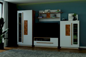 Шкаф с комбинированными распашными фасадами на петлях без доводчиков. Справа-фасад со стеклянной вставкой, слева-глухой фасад с декоративными элементами прямоугольной формы, имитирующими спил дерева. Эффект древесного рисунка достигается благодаря техники УФ-печати.