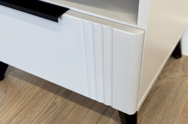 Тумба изготовлена из качественных материалов: корпус выполнен из ЛДСП, что гарантирует прочность и долговечность, а фасад,, выполненный из МДФ в плёнке ПВХ, не только выглядит эстетично, но и защищает тумбу от повреждений. Особое внимание заслуживает фрезеровка фасада, которая придаёт тумбе изысканный вид.