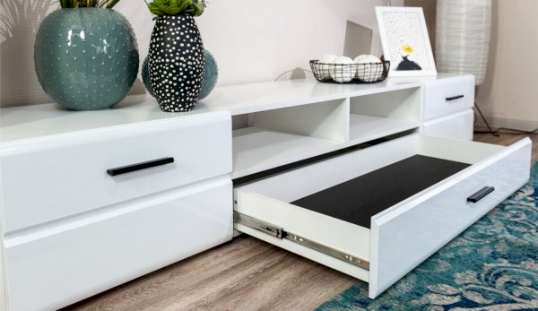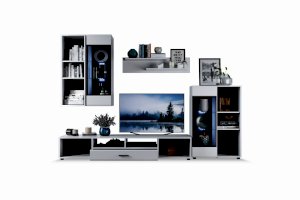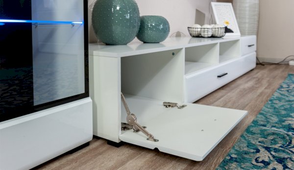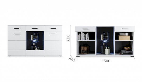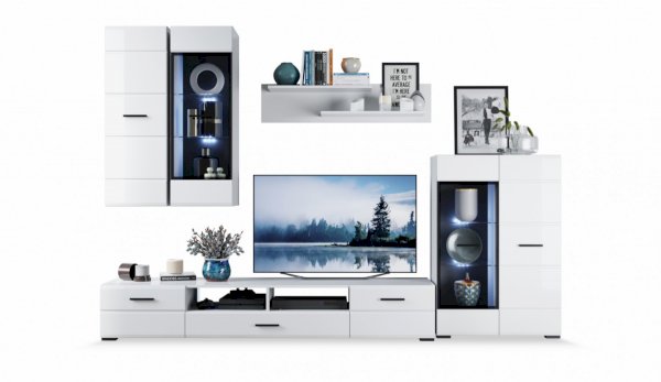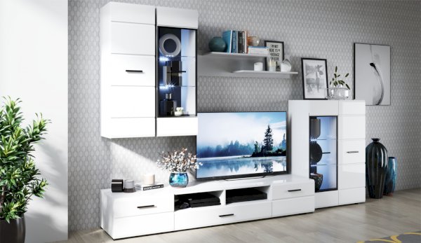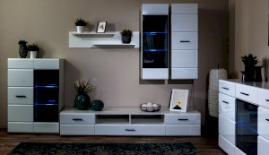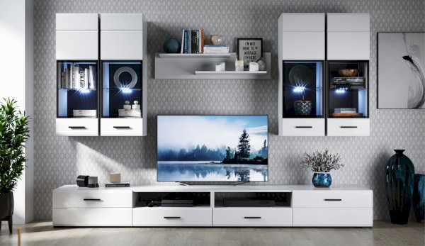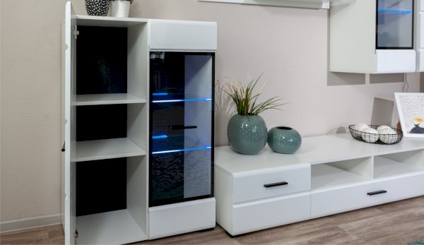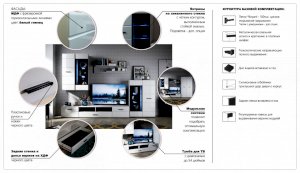 Модульная система Йорк выполнена в стиле минимализма. Строгие, лаконичные линии подчеркивают элегантность комплекта. Белый цвет мебели с деталями глубокого черного визуально сделает комнату светлее, просторнее и позволит составить безупречный по стилю комплект мебели. Сочетание глянцевой и стеклянной поверхностей, открытых полок создадут уютную обстановку и позволят украсить убранство комнаты приятными мелочами и разместить любимые книги и фото. Светодиодная подсветка придаст индивидуальность Вашей мебели. А широкая тумба для ТВ с выдвижными ящиками на телескопических направляющих позволит удобно разместить телевизор любой диагонали и другие медиаустройства Модульная система позволит подобрать по размеру вариант именно для Вашей комнаты, не оглядываясь на фиксированный размер, как в других стенках. Мебель выполнена из экологически безопасных материалов.