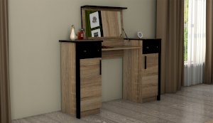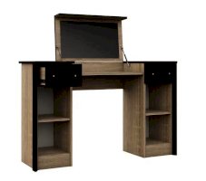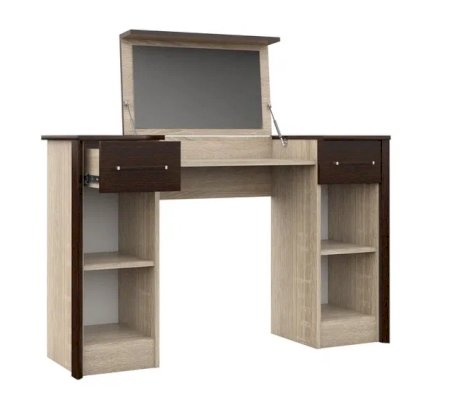 Туалетный стол с откидной столешницей - отличное место для хранения косметики. В тумбах расположены выдвижные ящики, в которых легко разместятся приспособления для сушки и укладки волос. Контрастный профиль из МДФ 22мм по краям модуля и крышка стола с безопасными скругленными краями. Кромка цвета венге подчеркивают древесную текстуру и рисунок светлого дуба сонома. Отлично сочетается по стилю с пуфом Эшли.