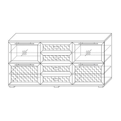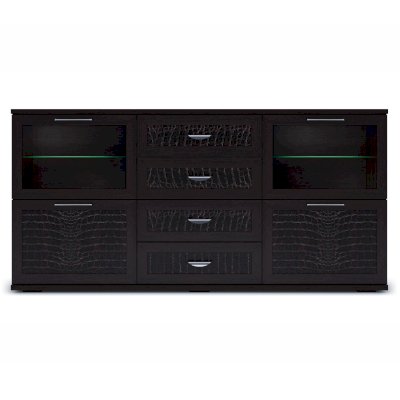 Комодино состоит из 3-х секций. Центральная комплектуется 4-мя ящиками на телескопических шариковых направляющих полного выдвижения с декором в центральных частях фасадов. Боковые секции делятся на две части. Верхние закрыты фасадами с тонированными стеклами, за которым располагаются стеклянные полки, а нижние — глухими с декоративными вставками из экокожи caiman темного цвета.